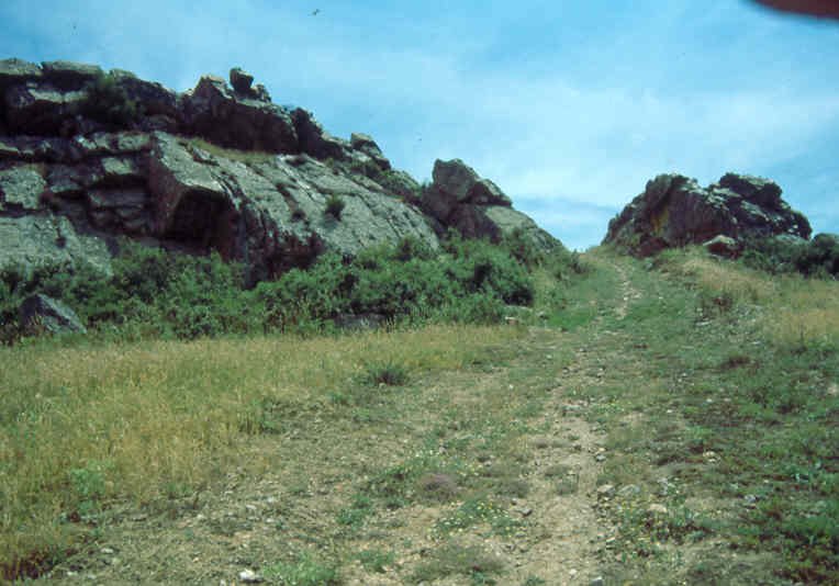Planta topográfica. Vestigios de murallas y una puerta con escalera en la roca