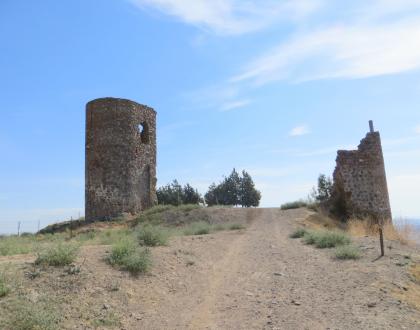 Mantiene dos torreones que flanqueaban la entrada principal y restos de tapial de la muralla.