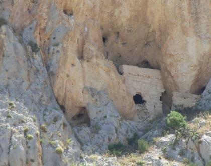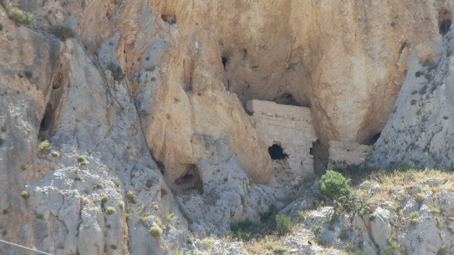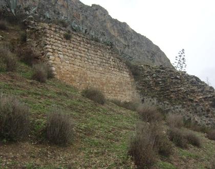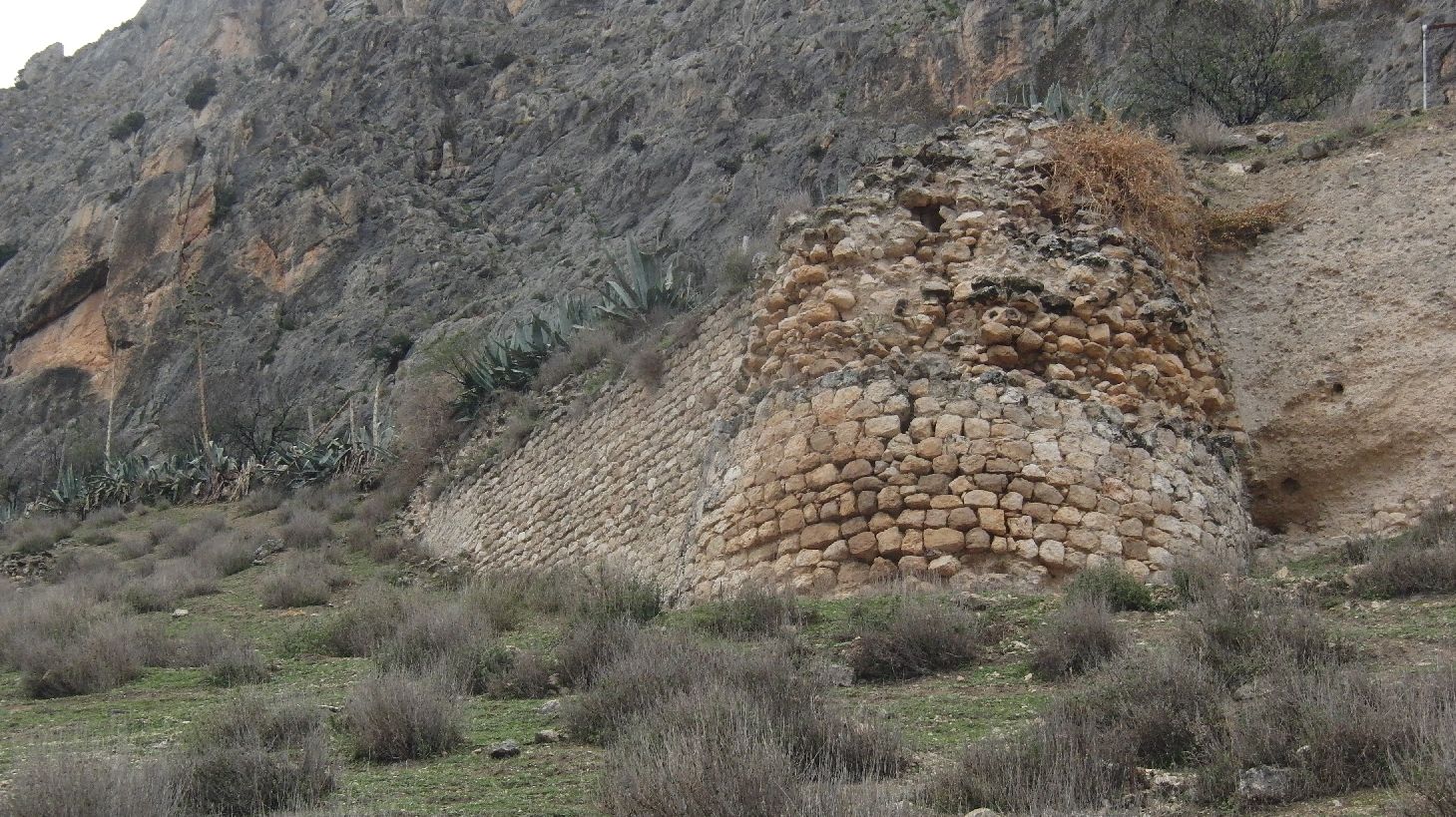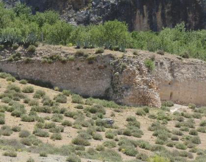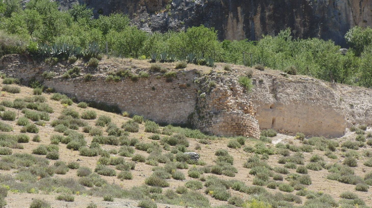 Muros que sirven de contención del terraplén,. Existen restos de un torreón circular y otro cuadrado, restos de aljibe de calicanto, existencia de una gruta en la roca protegida por un parapeto de sillería.