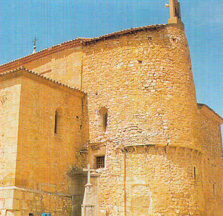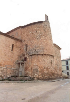 Abside con vestigios de fortificación. Torre cuadrada con saeteras y ménsulas de una buharda (estaba aislada hasta que en 1864 se unió a la iglesia).Abside con aspillera y gran altura