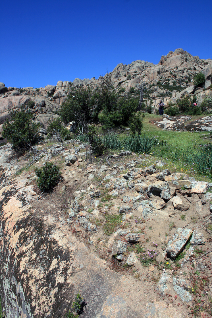 Muros de aterrazamiento entre los bolos graníticos que sirven también como elementos defensivos. Estos muros ocupan las terrazas inferiores del cerro. Dos tramos de escalera tallada en la roca conducen hasta la cumbre, en la que se abren varios aljibes en la roca.
