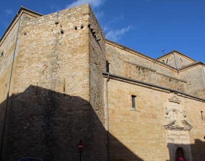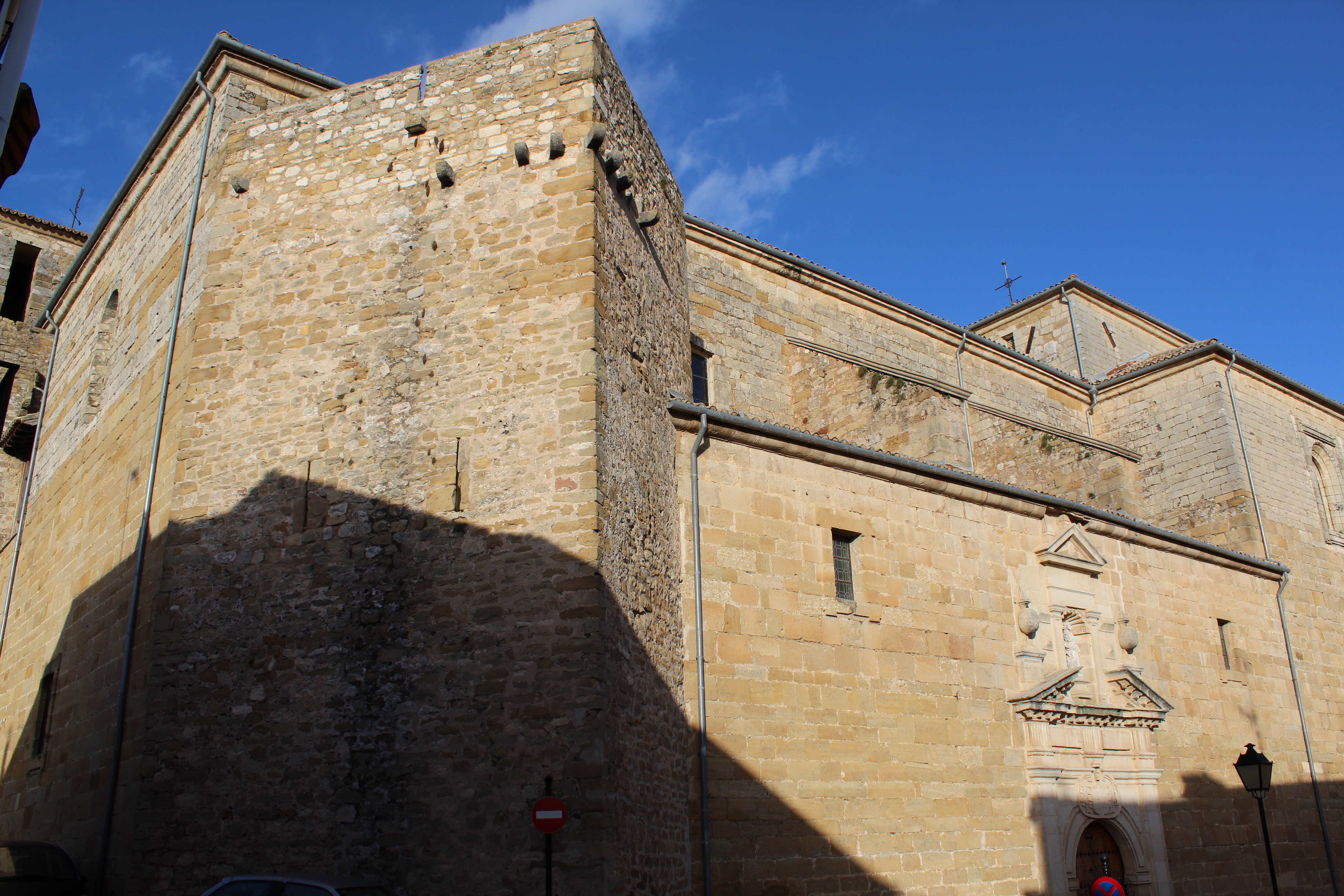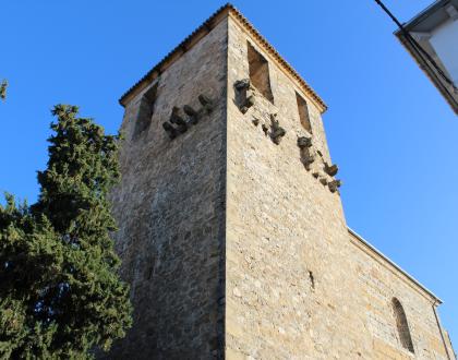 El campanario actual se corresponde con la que fuera torre del homenaje del castillo, de planta cuadrangular, conserva matacanes. Además perdura otra torre medieval cerca de la puerta de acceso al templo.