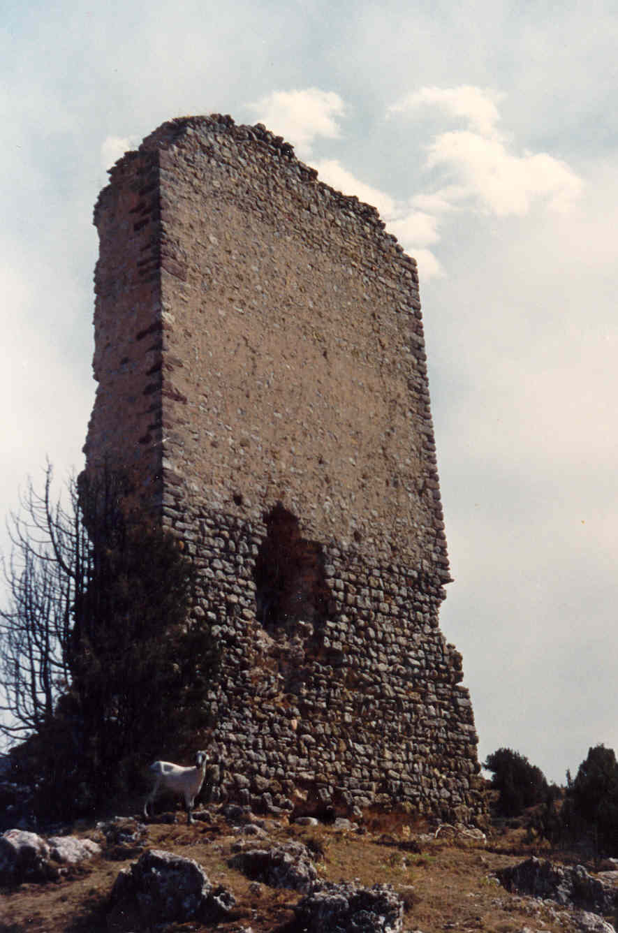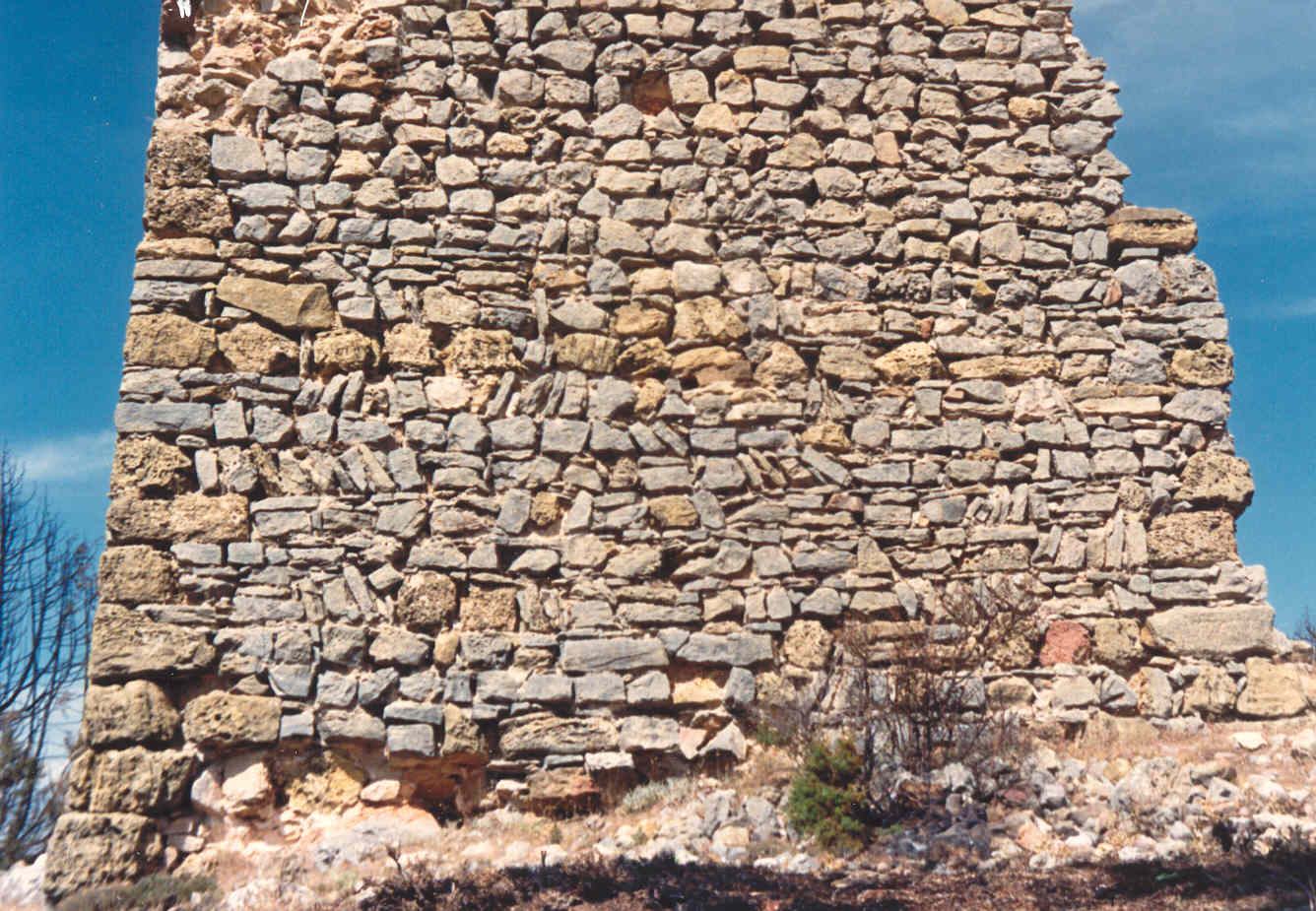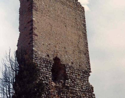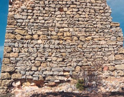 Caras sur y oeste completas. Tuvo cinco plantas: primera maciza, segunda con sillarejo a sardinel. Agujero del la puerta en el primer piso.