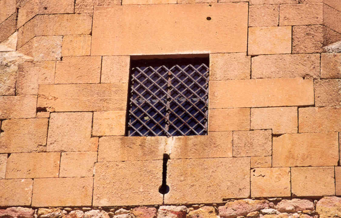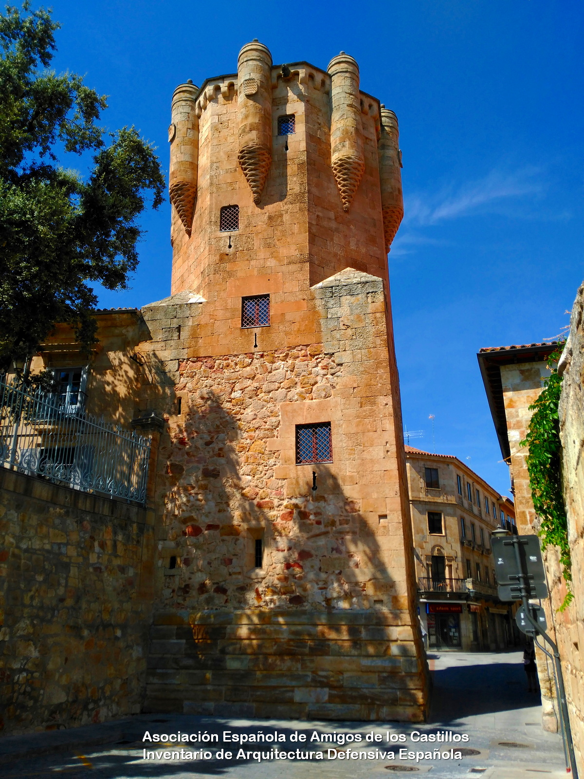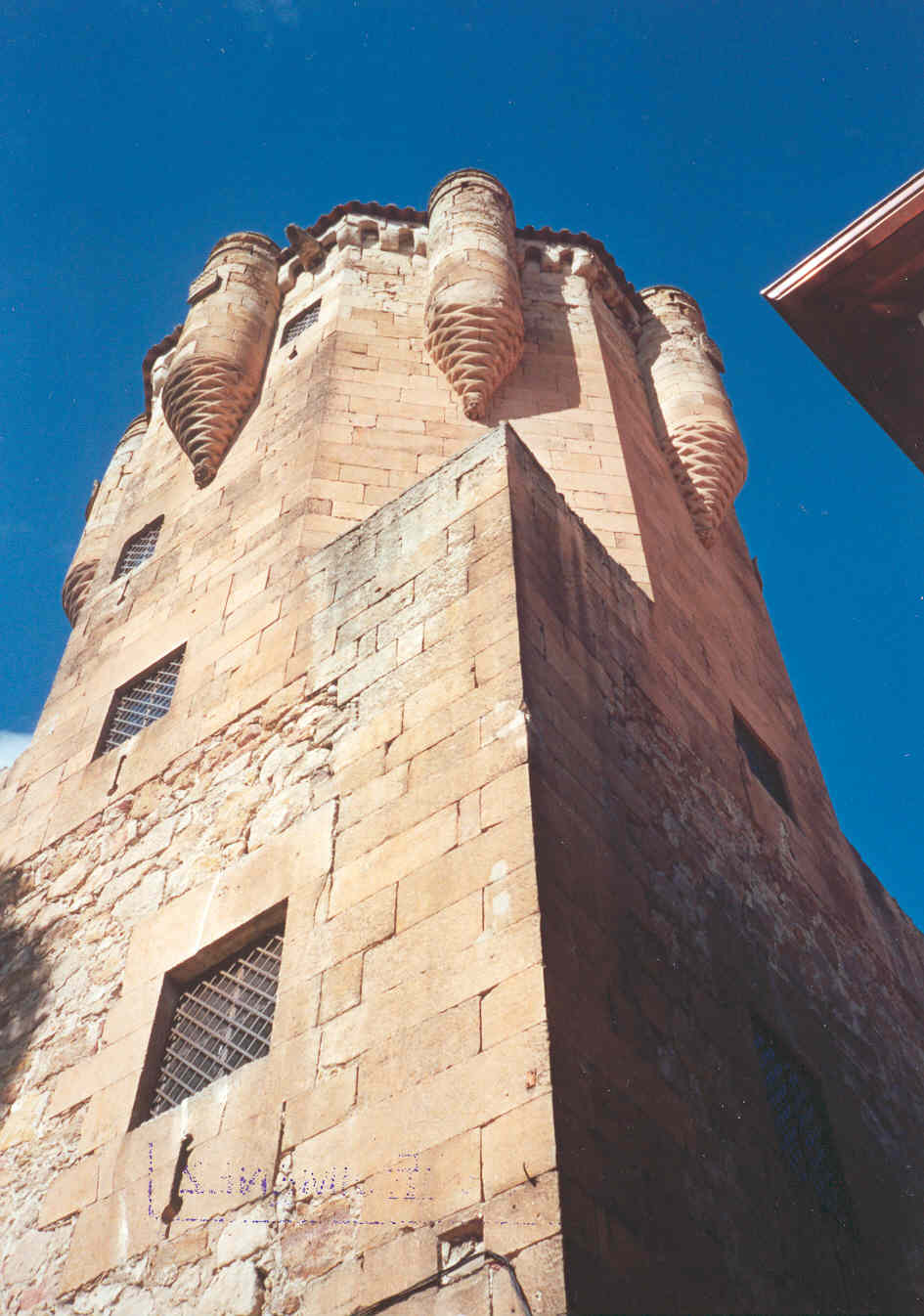 Sobre una base cuadrada, se transforma en octogonal a la altura del segundo piso, con un garitón en cada cara. Todas las ventanas tienen saeteras-troneras.