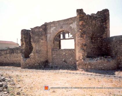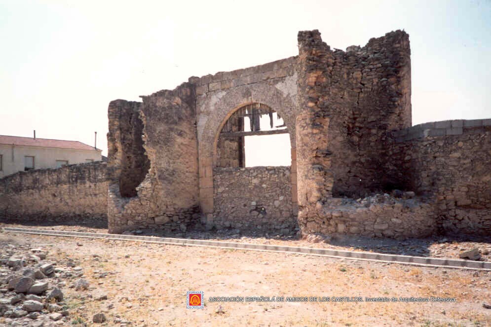 Conserva los muros de cerramiento y dos torres con almenas que protegian la entrada