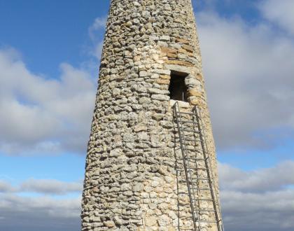 Torre troncocónica maciza en la base. Entrada en alto. Desmochada