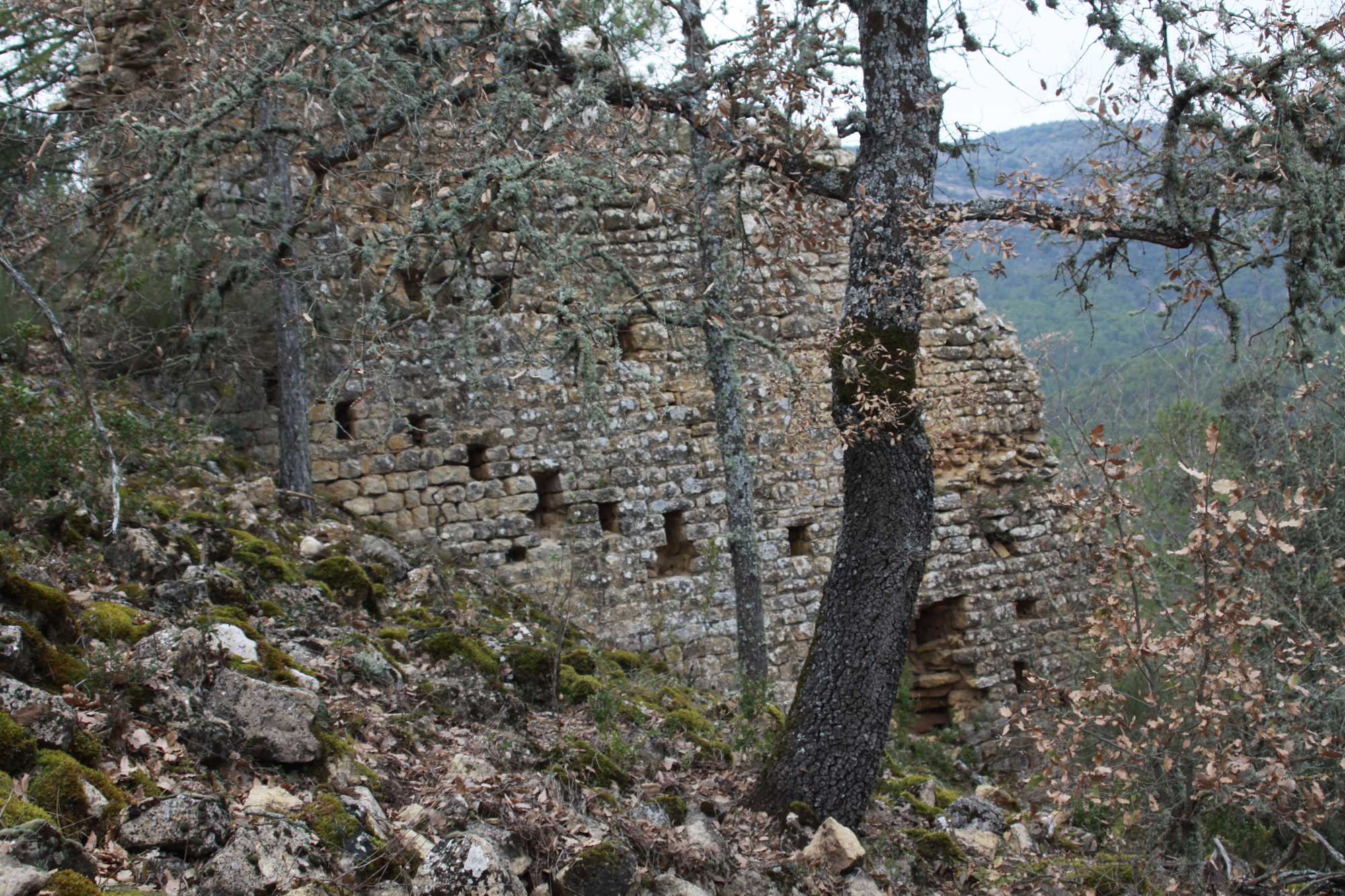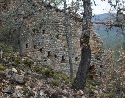 Los restos del recinto murado destacan por su gran altura y por su serie de aspilleras escalonadas que denotan lo primitivo de su construcción.