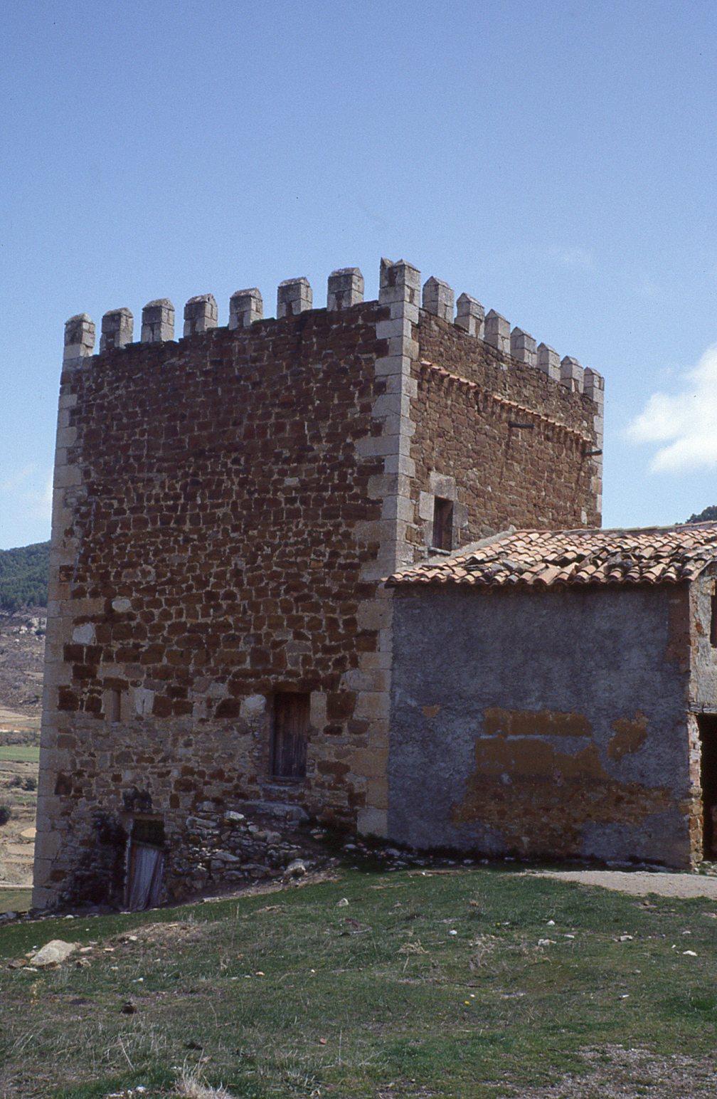 Gran arco de medio punto en la planta baja, saeteras en la primera planta, una ventana en el segundo piso, alemenas en la parte superior estas tienen saeteras actualmente cegadas.