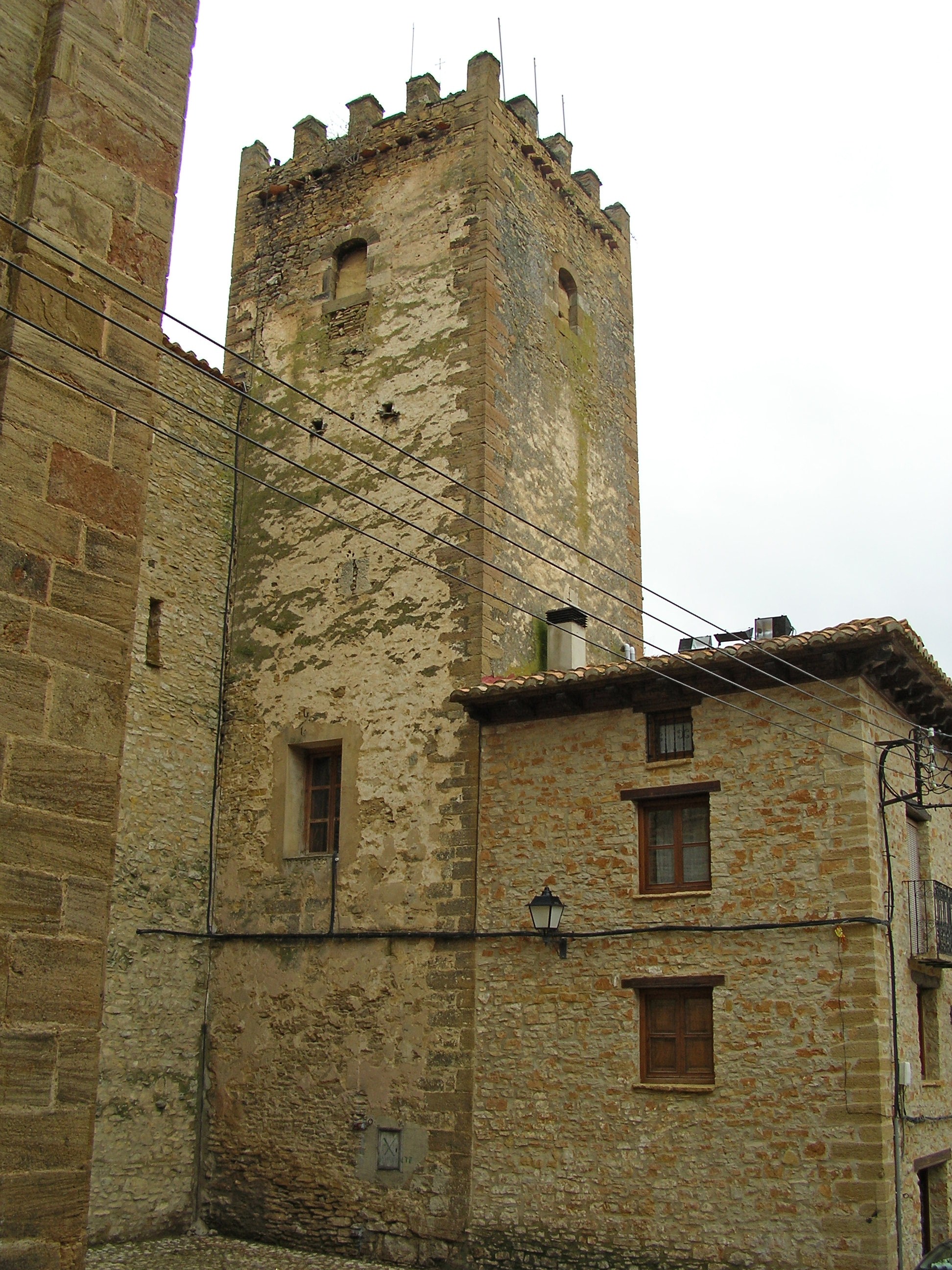 La torre se encuentra adosada al edificio ocupado actualmente por el Ayuntamiento sobresaliendo de él tanto en planta como en alzado. Es de planta cuadrada de unos 5 metros de lado y su obra es de mampostería reforzada por sillares en las esquinas. En sus muros aparecen escasos vanos y conserva el remate almenado, aunque este podría ser un añadido posterior pues debajo de él aparecen las ménsulas que sostendrían un matacán corrido. Todo el conjunto, torre y edificio, ha sido restaurados. La villa estuvo amurallada conservando el portal semicircular de San Miguel.