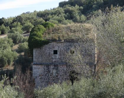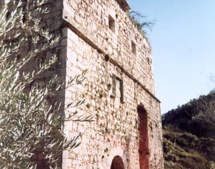 Molino con elementos fortificados que tiene una vivienda en la parte superior.