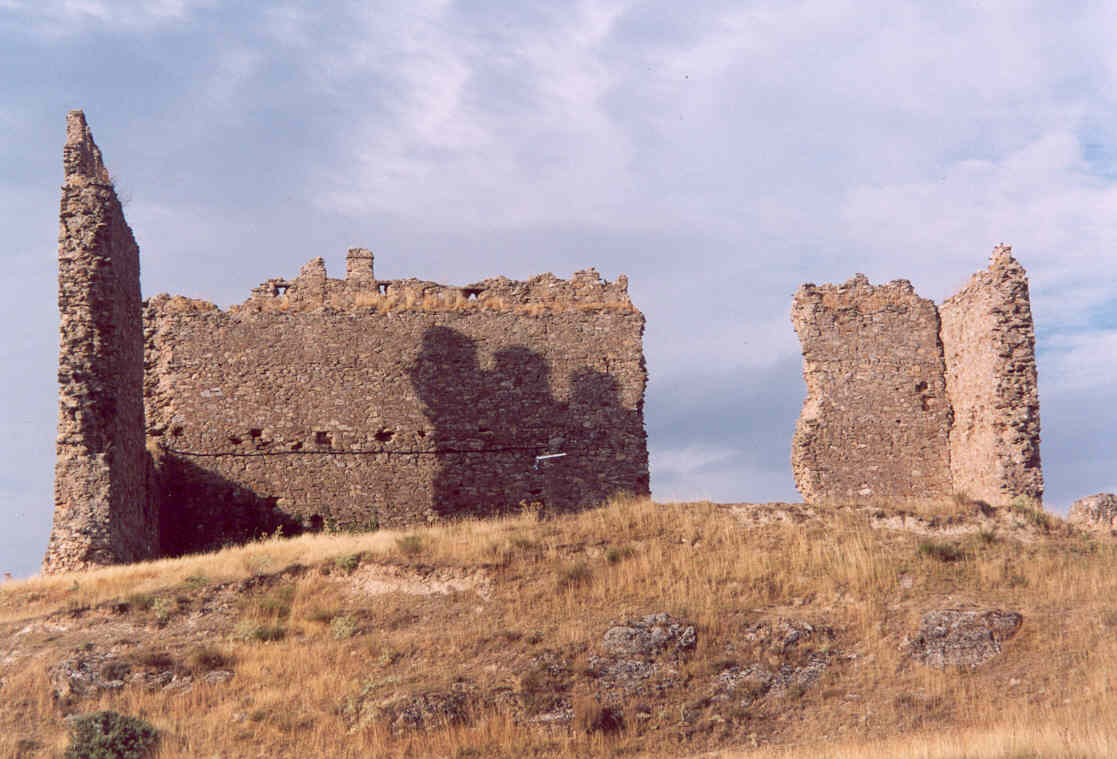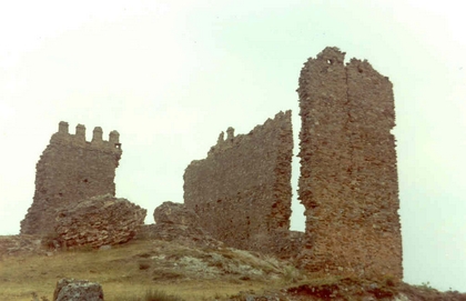 Quedan varias paredes de un torreón rectangular y varias almenas apiramidadas.