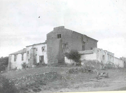 Cerca almenada con puerta semicircular cuya principal pieza es una ermita románica con una buharda y ábside semicircular.