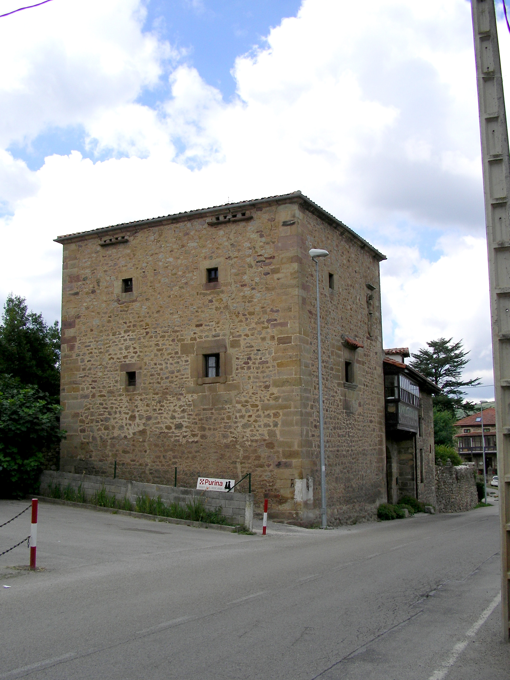 Acceso de arco apuntado y pocos vanos estrechos. Saeteras ojivales. A su lado se alza una gran torre adornada de un ventanal adintelado bajo guardapolvo y con escudo que la fecha en el XVI.