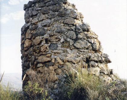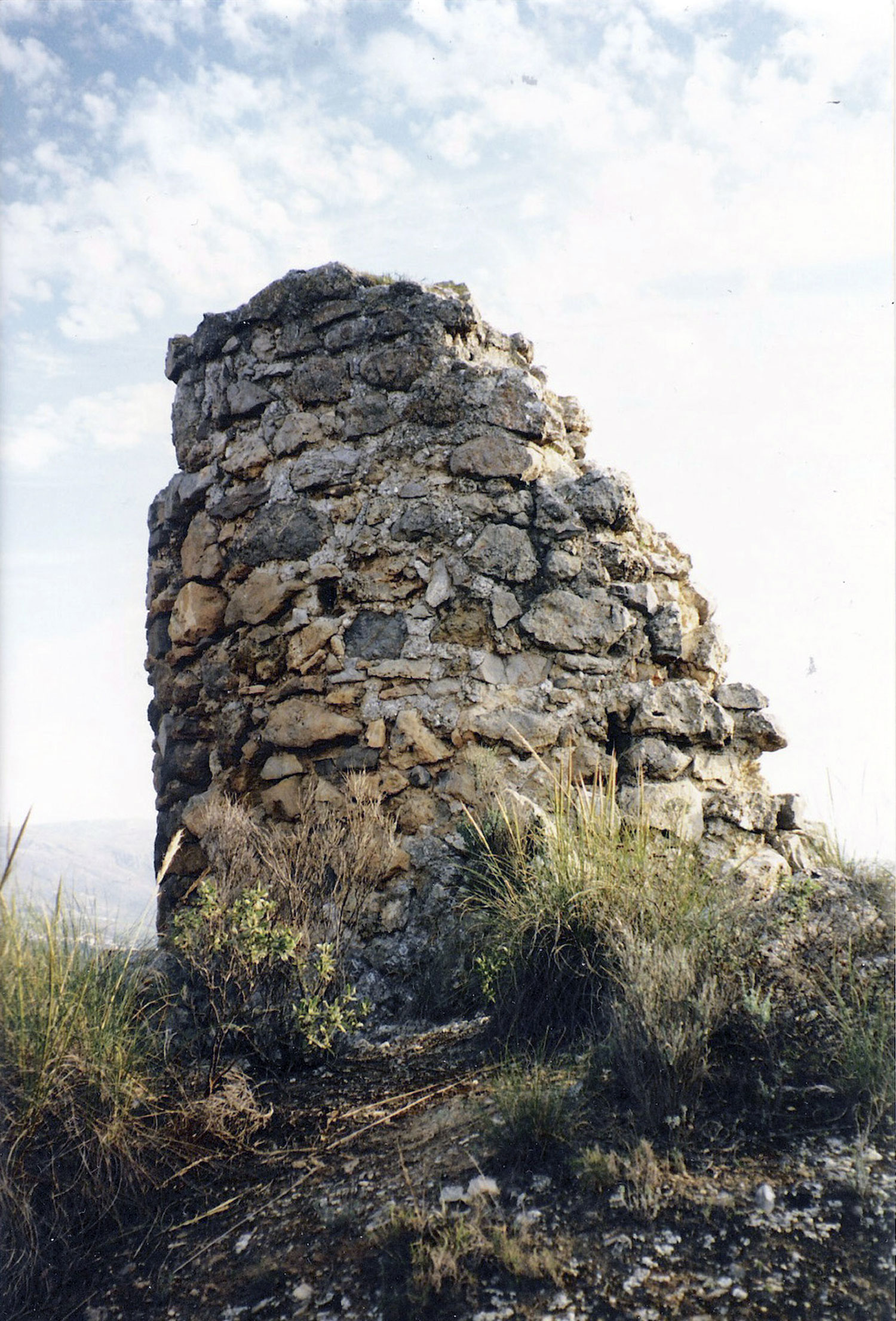 Torre de forma cilíndrica levantada sobre plataforma de nivelación, conserva una altura de 3,40 m, se observan huellas de mechinales.