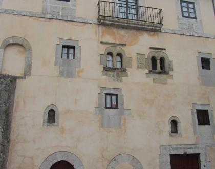 El Palacio se estructura en dos cuerpos independientes que se articulan por dos pasadizos que unen las plantas nobles de ambos edificios. Sobre la fachada principal se conservan los vanos primitivos de arco de medio punto, geminados y distribuidos de forma irregular. En el piso noble se conserva el escudo de los Rivero labrado en arenisca
