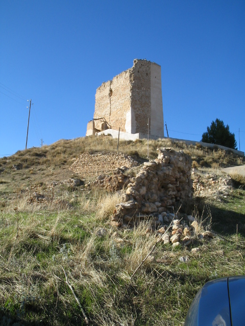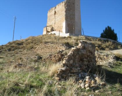 Vestigios del recinto y torre rectangularde tres plantas. Saeteras en la última planta.