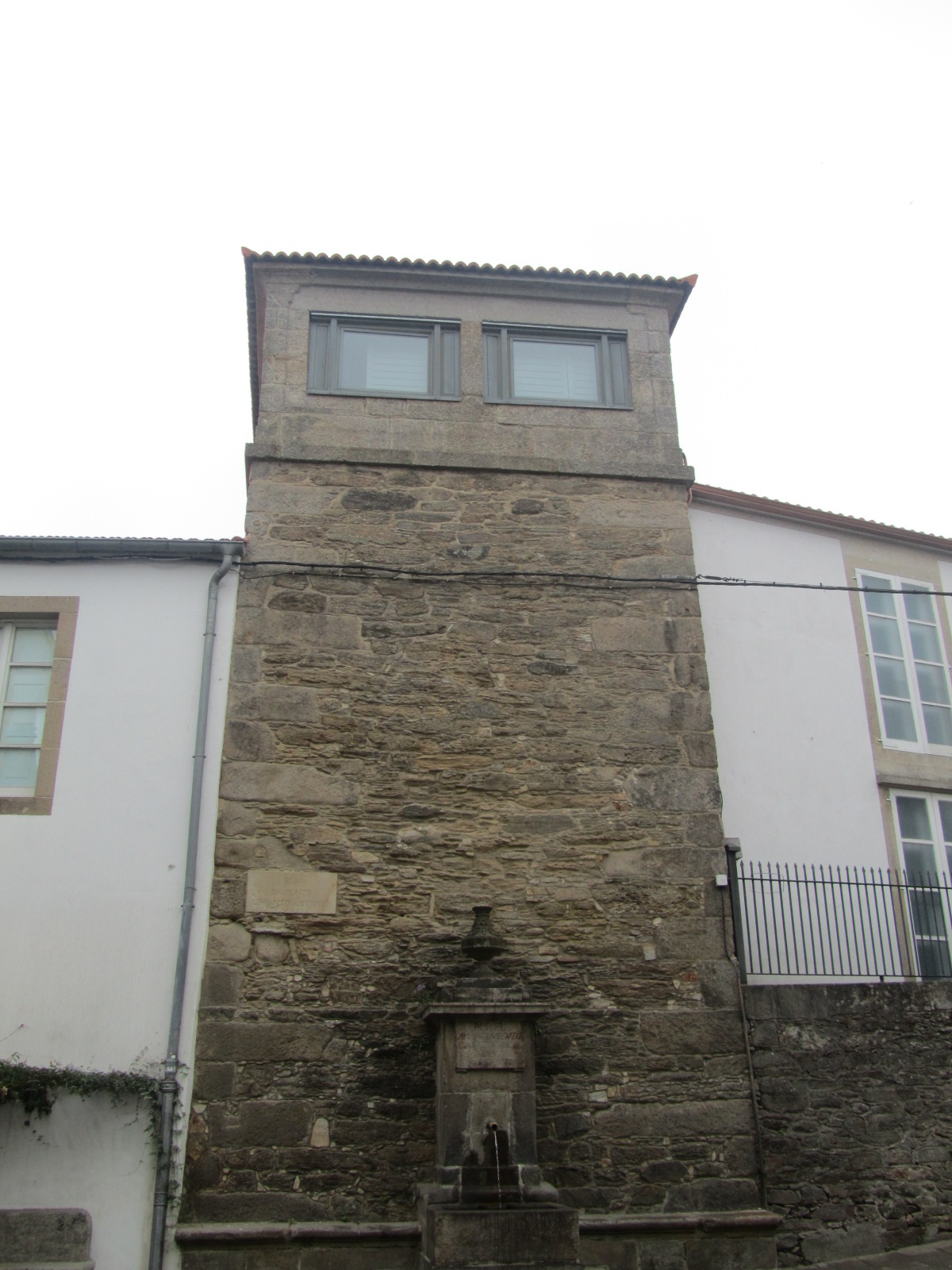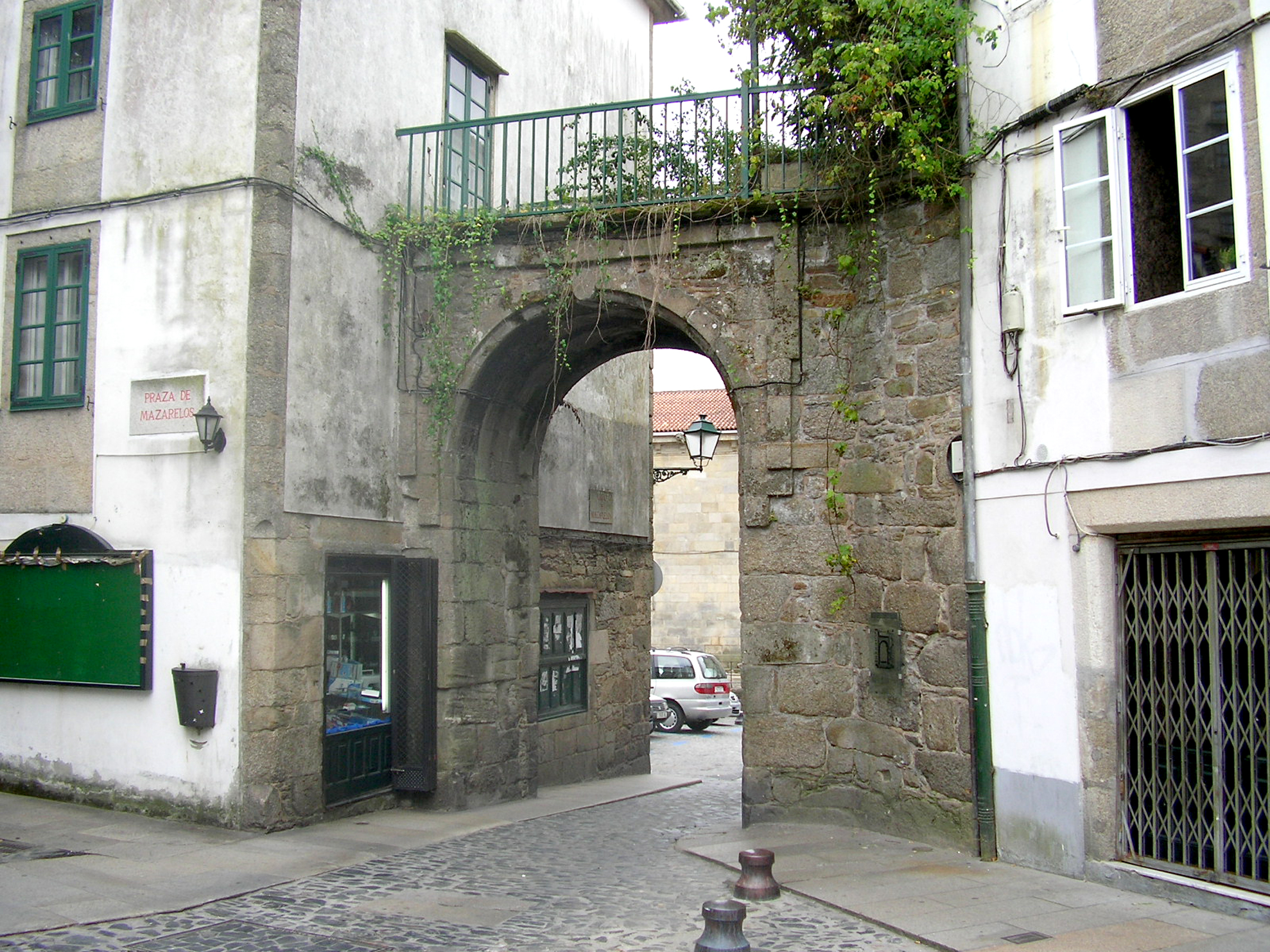 Es el mejor vestigio de la antigüa muralla que rodeaba el ''burgo'' de Santiago durante la Edad Medieval, que por lo demás tenía otros 6 puntos de entrada: Porta da Pena, Porta daCamiño por donde entraban los peregrinos del Camino Francés, Porta da Mamoa, Porta Faxeira, Porta da Trinidades o de A Matría y finalmente Porta da Sofrades. En la actualidad no conserva ninguana. La Porta de Mazarelos daba paso a una plaza donde se establecía el mercado de Mazarelos, especializado en vinos y frutas. Además, había otras calles y plazuelas especializadas en los distintos oficios que florercieron en esa época, como selleiros, caldeiros, azabacheiros...De esta forma muchas calles de hoy tomaron esos nombres.