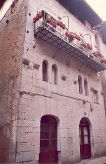 Tres plantas. Dos accesos de arco de medio punto. Segundo piso con galeria de vanos e hilera de canes. Camarote y tejadp modernos. Fachada trasera con arranque de restos de muralla, dos saeteras y ladronera."Torre urbana de gran belleza en la fachada principal, donde vemos dos accesos a la planta baja: uno de medio punto y otro rebajado. En la primera planta de dicha fachada hay dos ventanas geminadas, apuntadas, ya la 2ª planta, nos ofrece algunas ventanas en arco rebajado, y un acceso del mismo tipo que s
