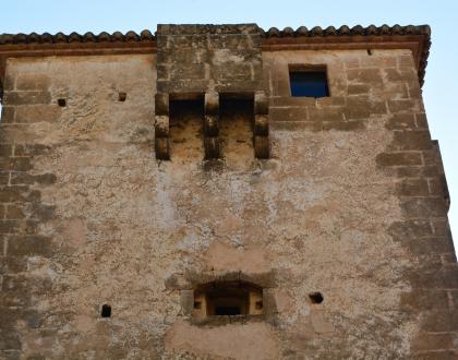 Solo se conserva del palacio un sólido torreón con balcones amatacanados en todos sus frentes.
