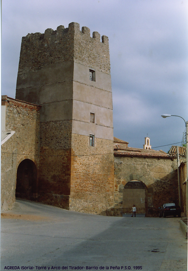 Dejando a parte el barrio moro y tanto su existencia en época islámica como alguna posible fase cristiana anterior, Ágreda fue reconquistada por Alfonso el Batalldor de Aragón hacia 1118 y repoblada con gentes de los pueblos vecinos de la sierra norte (Yanguas, etc) que crearon sus propios barrios amurallados. En la unión e dos de ellos, el de la Peña y el de San Miguel, se alza este torreón protegiendo un puerta. Podría ser una obra posterior a la muralla en sí, y haberse levantado en el s. XIV con ocasión de las guerras entre Pedro el Cruel de Castilla y Pedro el Ceremonioso de Aragón.