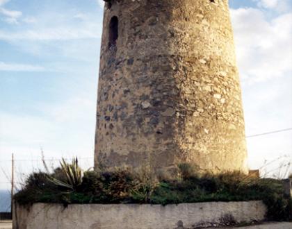 Torre en forma troncocónica ligeramente ataluzada y de planta circular de 7,50 metros de diámetro y unos 12 metros. Está construida con mampostería de piedras de mediano tamaño y enlucido de mortero rico en cal. Arco de medio punto y jambas de ladrillo. Conserva algunas troneras, parapeto y matacán.